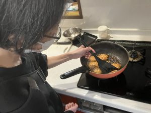 メニュー決めをしていただき、工程を確認。片手でも行えるよう助言し、鶏つくね作りを行ないました。